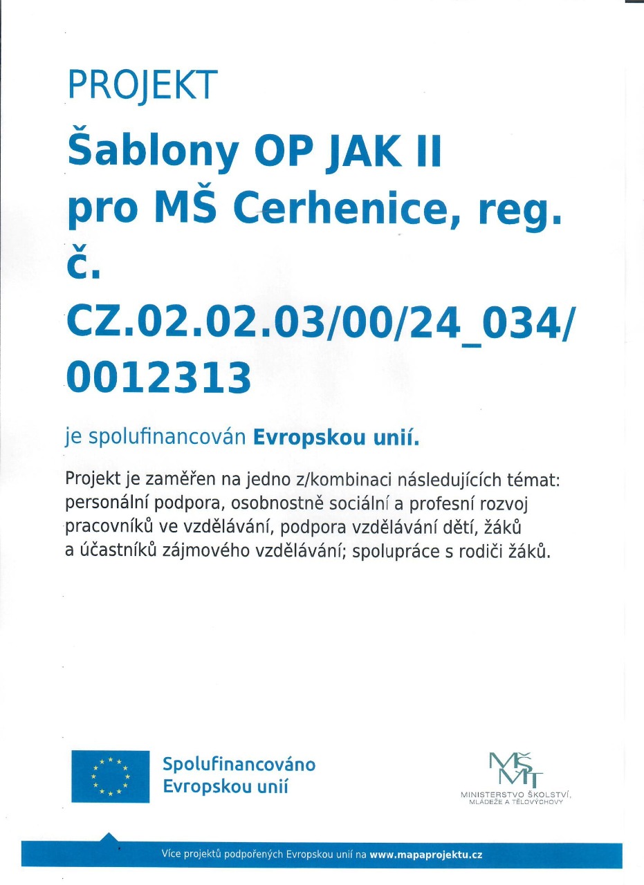 Mateřská škola Cerhenice je zapojena do projektu Šablony OP JAK I (2023-2024)